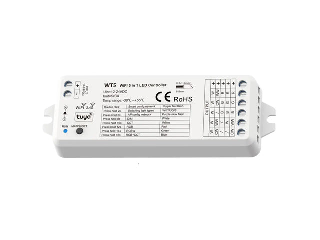 - DC-voeding en 5-kanaals constante spanning uitgang: Voorziet uw LED-strips van de juiste spanning.