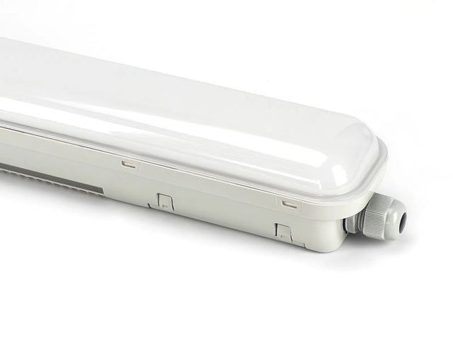 Cet éclairage fluorescent Tri-proof a une norme IP65 et peut être placé à l'extérieur dans les espaces publics et dans les zones humides telles que les réfrigérateurs et les parkings. Cette lampe résiste également à la poussière, à la corrosion, aux rayons UV et peut résister à un coup.