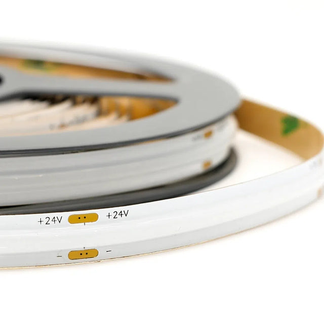 Le ruban utilise une structure COB où les puces LED sont directement montées sur un FPCB double face. Cela permet une diffusion extrêmement uniforme, idéale pour des applications décoratives haut de gamme telles que: